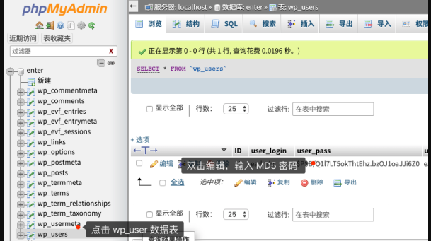 通过 phpMyAdmin 修改密码和通过 MySQL 命令修改密码的原理其实是一样的,都是通过修改数据库中的 WordPress 加密密码字符串来实现的