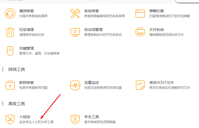 然后再打开安全工具,就能看见火绒剑了