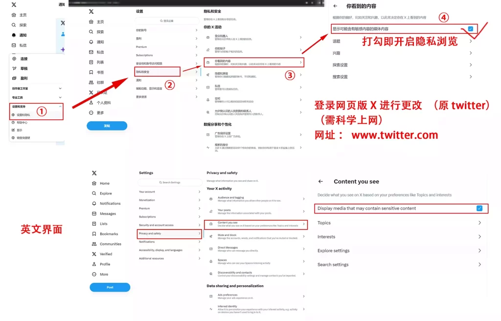 X(原twitter)开启显示可能含有敏感内容的媒体内容方法:(需科学上网)