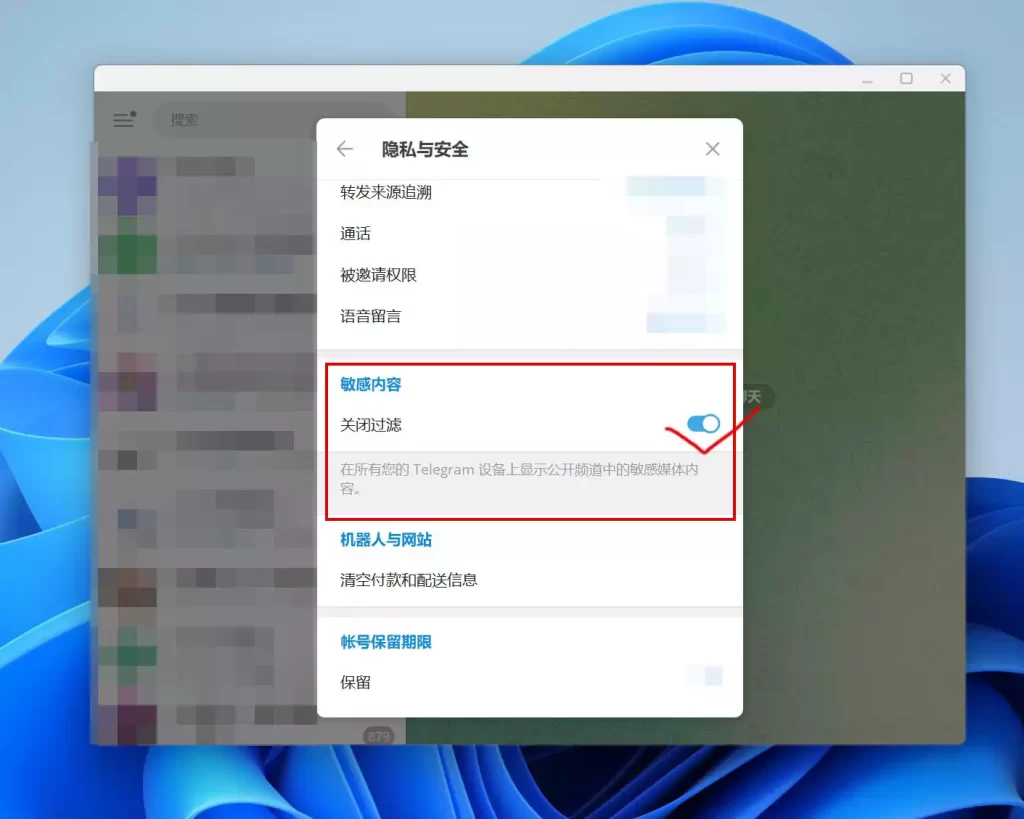 【方式a】:打开 Desktop 电脑桌面客户端, 左上角三短线: 设置→隐私安全→开启”显示含有敏感内容的媒体”